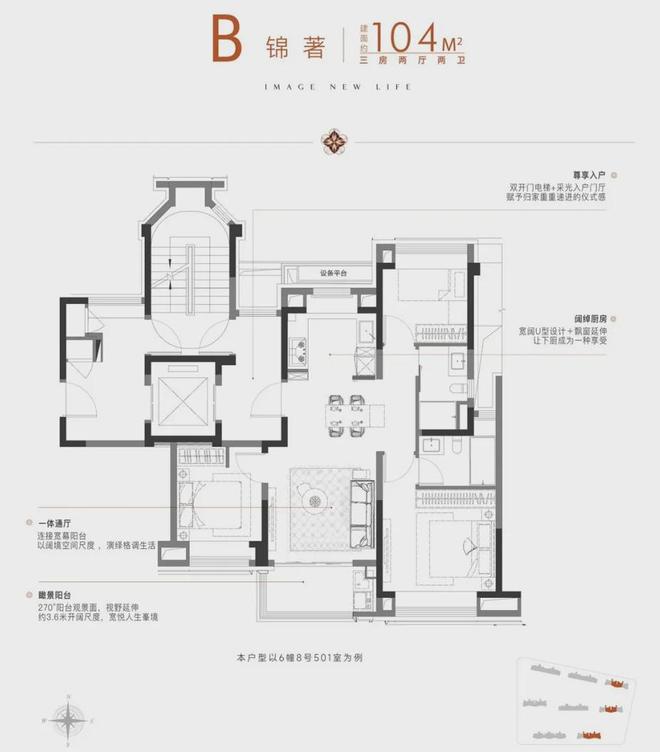 :采用LDK洄游式景观边厅设计,南向面宽达10.3米,主卧套房带270°转角飘窗及独立衣帽间,客餐厅可轻松容纳六人餐桌,得房率约74%。