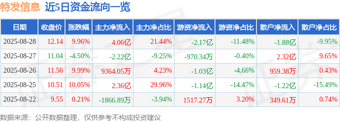 kaiyun证券之星消息,特发信息8月28日涨停收盘,收盘价12.14元。该股于10点6分涨停,未打开涨停,截止收盘封单资金为8555.29万元,占其流通市...